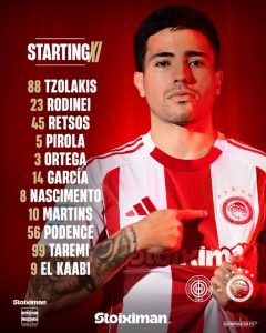 Τερματοφύλακας Τζολάκης και τετράδα, από δεξιά προς αριστερά, οι Ροντινέι-Ρέτσος-Πιρόλα -Ορτέγα. Στη μεσαία γραμμή Νασιμέντο-Ντάνι -με Ζέλσον -Ποντένσε στα άκρα και επιθετικό δίδυμο τους Ελ Κααμπί-Ταρέμι.