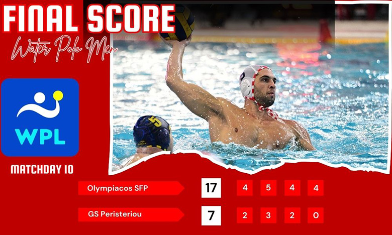 Μετά την άνετη νίκη (20-8) επί της Βάσας στο Παπαστράτειο κολυμβητήριο, στη «μάχη» της 5ης αγωνιστικής της φάσης των ομίλων του Champions League, η ομάδα πόλο Ανδρών του Ολυμπιακού επέστρεψε νικηφόρα στο πρωτάθλημα, διευρύνοντας το σερί της. Οι «ερυθρόλευκοι» νταμπλούχοι Ελλάδας νίκησαν με 17-7 τον ΓΣ Περιστερίου στο κολυμβητήριο του Πειραιά, στο ματς της 10ης αγωνιστικής της Water Polo League, με κορυφαίο τον Φουντούλη, με έξι γκολ.