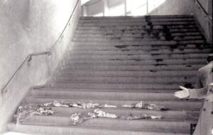 Ένας φίλαθλος θα γλιστρήσει πάνω στα πεταμένα πλαστικά μαξιλαράκια που βρίσκονταν στα σκαλοπάτια λίγο προτού φτάσει στο τέλος τους, παρασύροντας και άλλους που ήταν ήδη εκεί. Αυτοί που ακολουθούσαν θα πέσουν πάνω στους πρώτους, με τον κόσμο να συνεχίζει να ορμάει και να τους καταπατά καθώς όπως είπαμε, δε γνώριζε τι συνέβαινε μπροστά.