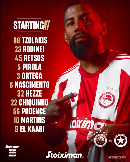 Κίπερ ο Τζολάκης, και τετράδα μπροστά οι Ροντινέι-Ρέτσος-Πιρόλα-Ορτέγα. Εσε-Νασιμέντο και Τσικίνιο η τριάδα στη μεσαία γραμμή με Ζέλσον -Ποντένσε και Ελ Κααμπί τριάδα μπροστά.