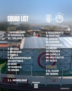 Η αποστολή: Μπιανκόν, Μπρούνο, Καμπελά, Τσικίνιο, Κοστίνια, Γκαρθία, Ελ Κααμπί, Μαρτίνς, Έσε, Καλογερόπουλος, Κουράκλης, Μάνσα, Μουζακίτης, Νασιμέντο, Ορτέγκα, Πασχαλάκης, Πιρόλα, Ποντένσε, Σιπιόνι, Ταρέμι, Τζολάκης, Βέζο, Γιαζίτζι.