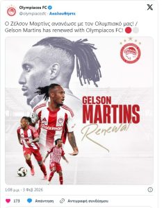 Με την “Ερυθρόλευκη” ομάδα να γνωστοποιεί και επίσημα την ανανέωση της συνεργασίας της με τον Πορτογάλο που μετρά 23 συμμετοχές -4 γκολ και ασίστ φέτος ,τρία γκολ απο αυτά στο Τσάμπιονς Λιγκ ,με Καιράτ,PSV και Αγιαξ.