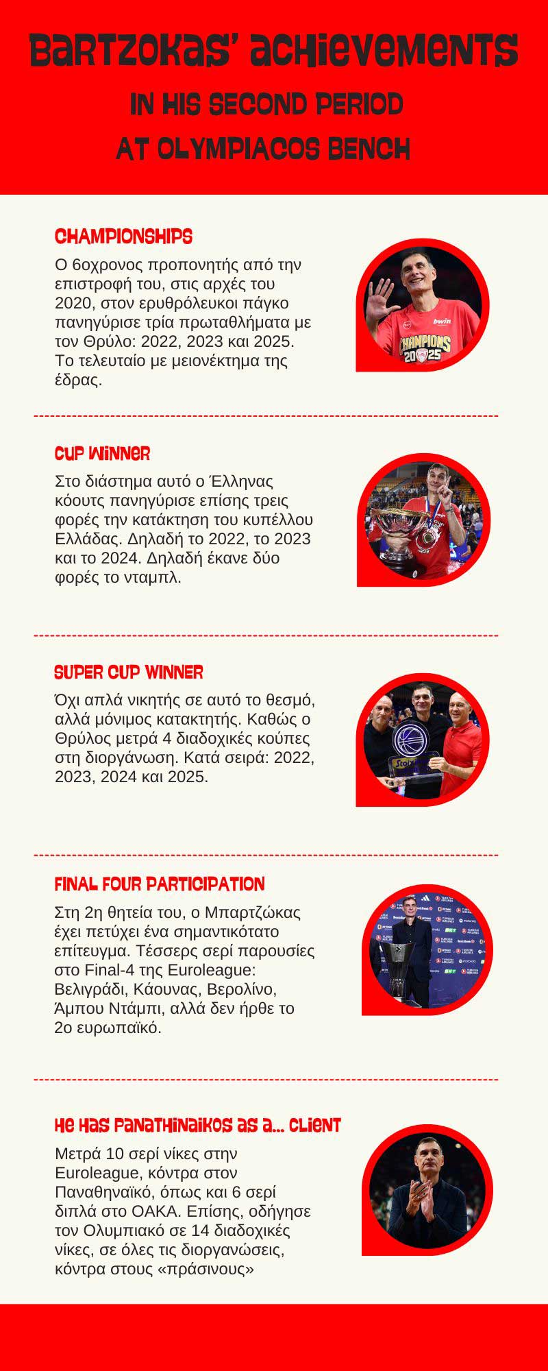 Ενδεικτικά αναφέρουμε ότι ο Γιώργος Μπαρτζώκα συνολικά έχει κατακτήσει με τον Θρύλο και στις δυο σπαστές του θητείες 12 τίτλους εάν προστεθούν φυσικά η κατάκτηση της Back2 back Ευρωλίγκας στο Λονδίνο το 2013 και η κατάκτηση του Διηπειρωτικού τροπαίου τον Οκτώβρη του 2013 κόντρα στην Πινέιρος Σκάι!