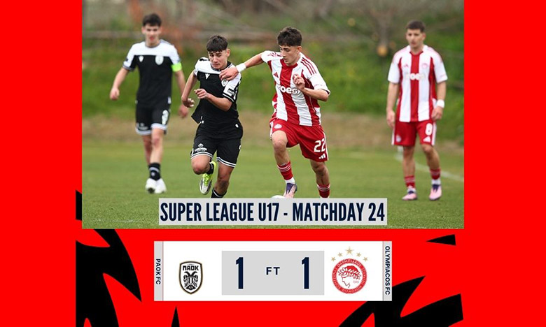 Ισόπαλο με σκορ 1-1 ολοκληρώθηκε το παιχνίδι της ομάδας Εφήβων του Ολυμπιακού κόντρα στον ΠΑΟΚ για την 24η αγωνιστική του πρωταθλήματος Super League K17.