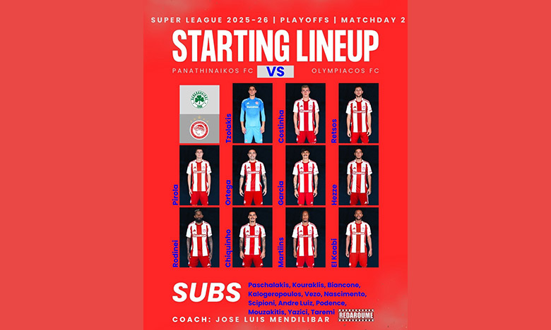 Κάτω από τα δοκάρια ξεκινάει ο Τζολάκης, ενώ την αμυντική τετράδα από δεξιά προς τα αριστερά συνθέτουν οι Κοστίνια, Ρέτσος, Πιρόλα και Ορτέγκα.