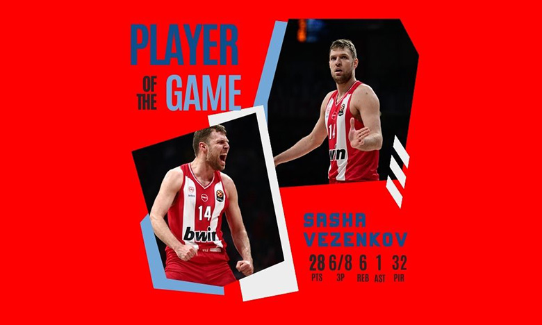 Κορυφαίος των νικητών, που ανέβηκαν στο 14-8 και εδραιώνονται στην πρώτη 6άδα, ήταν ο Σάσα Βεζένκοφ με 28 πόντους (4/6δ., 6/8τρ., 2/2β.), 6 ριμπάουντ και 32 μονάδες στο σύστημα αξιολόγησης, Με τον ασταμάτητο Σάσα να μπαίνει σε τροχιά MVP Ευρωλίγκα, δίνοντας συνέχεια στις καταπληκτικές του εμφανίσεις