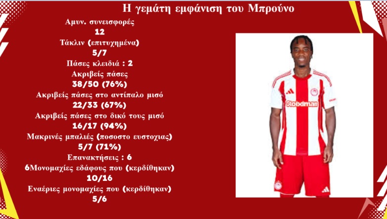 Είτε αμυντικά,είτε επιθετικά,με εξαίρεση την κακή του σέντρα στο 89,με τον Ταρέμι στο πρώτο δοκάρι ,ο Μπρούνο έκανε μια γεμάτη εμφάνιση και δικαίωσε τον προπονητή του.