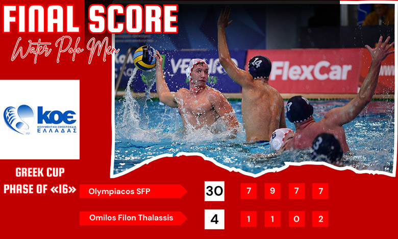 Στην προημιτελική φάση του Κυπέλλου Ελλάδας προκρίθηκε η ομάδα πόλο Ανδρών του Ολυμπιακού. Με πρώτο σκόρερ τον Πούρο, με έξι γκολ, οι «ερυθρόλευκοι» νταμπλούχοι Ελλάδας νίκησαν με 30-4 τον ΟΦΘ στο Παπαστράτειο κολυμβητήριο, σε νοκ άουτ ματς για τους «16» του θεσμού και «σφράγισαν» άνετα το εισιτήριο για τη φάση των «8». Ο Θρύλος με άνεση στα προημιτελικά του Κυπέλλου.