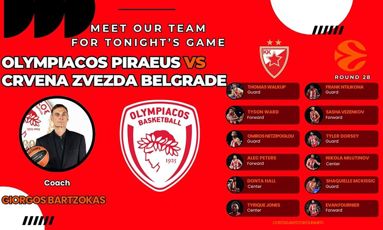 Από την άλλη, ο Κώστας Παπανικολάου παραμένει εκτός, όπως και οι Γιαννούλης Λαρεντζάκης, Κόρι Τζόσεφ και Μόντε Μόρις. Εκτός αγωνιστικής δράσης εδώ και αρκετό καιρό είναι οι Μουστάφα Φαλ και Κίναν Έβανς. Ολυμπιακός – Ερυθρός Αστέρας: Νιλικίνα στη 12άδα.