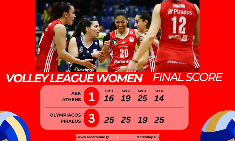 Μετά την πρόκριση στο Final-4 του κυπέλλου Ελλάδας και πριν το μεγάλο ματς με το Μιλάνο, νίκη στο πρωτάθλημα. Καθώς ο Θρύλος πραγματικά «μπλόκαρε» την ΑΕΚ μέσα στην έδρα της. Ειδικότερα, νίκησε 3-1 και συνεχίζει την προσπάθεια για την διεκδίκηση της πρώτης θέσης στην κανονική περίοδο. Ολυμπιακός: Επιβλητικές με 16 μπλοκ.