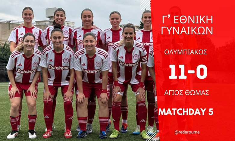 Πράγματι, ο Ολυμπιακός πέτυχε το 5/5 στον όμιλό του, στο πρωτάθλημα της Γ εθνικής Γυναικών. Ειδικότερα με εμφατικό τρόπο. Καθώς αυτή τη φορά ξεπέρασε τον… εαυτό του. Ειδικότερα «έγραψε» νέα κορυφαία επίδοση σε γκολ! Μιας και άφησε… πίσω τις νίκες με 10-0. Για την ακρίβεια, επικράτησε με 11-0 του ΠΟ Αγίου Θωμά. Στο Δημοτικό γήπεδο «Στ. Μελισσουργός», στο Ρέντη. Ολυμπιακός: Καταιγιστικές με νέο ρεκόρ σκοραρίσματος!