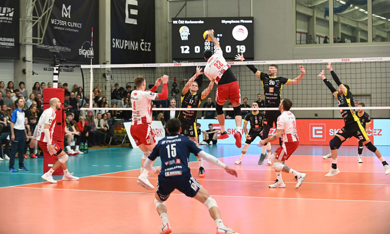 Στη συνέχεια, οι «ερυθρόλευκοι» μπήκαν καλά και προηγήθηκαν 12-9 με τον Σέντλατσεκ. Ωστόσο η Καρλοβάρσκο έβγαλε αντίδραση, γύρισε το ματς και πήγε στο +2 (16-14). Εντούτοις, ο Ολυμπιακός έκανε νέα ανατροπή, 21-22 με τον Ατανασίεβιτς, ενώ απώλεσε το πρώτο του σετ μπολ. Στο τέλος, το μπλοκ του Κροάτη ακραίου του έκανε το 24-26 για το 1-2.