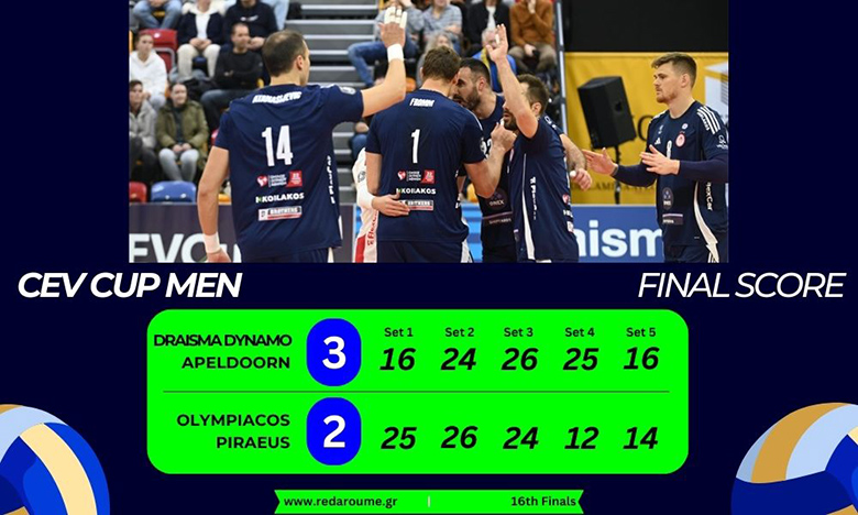 Λοιπόν η ευρωπαϊκή πορεία των «ερυθρολεύκων» στο CEV Cup συνεχίζεται. Καθώς ο Ολυμπιακός ξεπέρασε το «εμπόδιο» της Ντινάμο Άπελντορν. Ειδικότερα η δουλειά που άρχισε στο Ρέντη με τη νίκη 3-0 σε 72 λεπτά, τελείωσε στην Ολλανδία. Μιας και η ομάδα του Βουρδέρη πήρε τα δύο πρώτα σετ σε 48 λεπτά. Ανεξάρτητα αν μετά οι γηπεδούχοι επικράτησαν με 3-2. Έτσι πέρασε στους «16» του CEV Cup όπου θα αντιμετωπίσει την Καρλοβάρτσκο. Με το πρώτο ματς στο «Μελίνα Μερκούρη» και τη ρεβάνς στην Τσεχία.