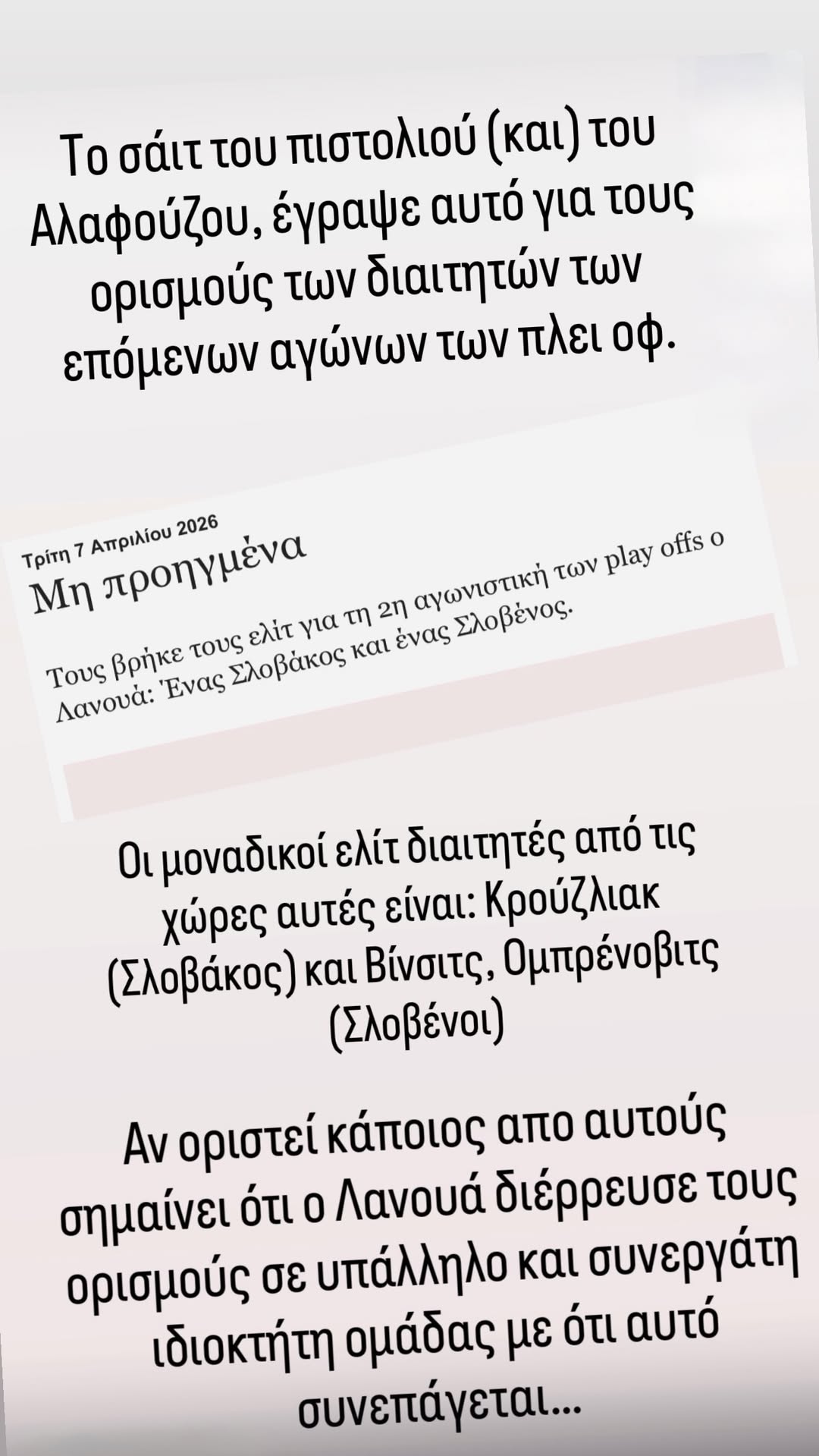 Οπως γράφτηκε σε διάφορα σαιτ, ο Λανουά έχει αποφασίσει να βάλει ELITE διαιτητές απο Σλοβενία και Σλοβακία οι οποίο είναι μετρημένοι στα δάχτυλα του ενός χεριού. Πρόκειται για τους Κρούζλιακ , Ομπρένοβιτς και Βίντσιτς.