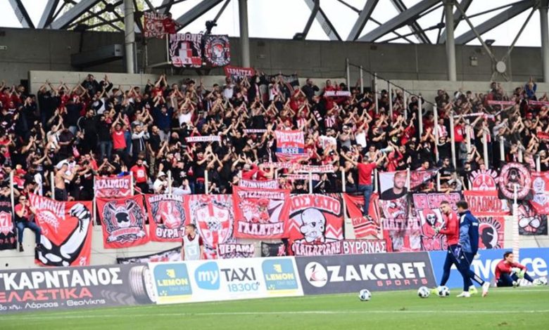 1.000 οπαδοί των «ερυθρόλευκων» ταξίδεψαν στη Λάρισα και βρέθηκαν στις εξέδρες της AEL FC Arena, γεμίζοντας την κερκίδα των φιλοξενούμενων και δημιουργώντας δυναμική ατμόσφαιρα υπέρ της ομάδας τους.