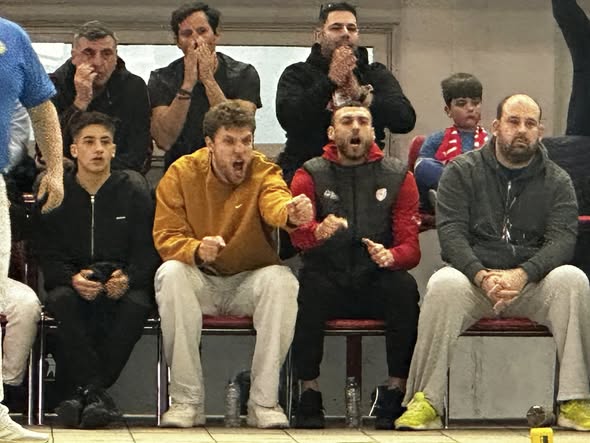 Οι δυο παίκτες της ομάδας Μπάσκετ του Ολυμπαικού λίγη ώρα μετά την εκτός έδρας νίκη επί του Πανιωνίου με 71-79 κατευθύνθηκαν στο κολυμβητήριο του Πειραιά ώστε να στηρίξουν την προσπάθεια της Κυπελλούχου ομάδας Πόλο απέναντι στον Παναθηναϊκό.