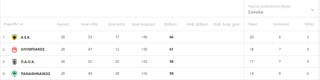 Αξίζει να σημειωθεί πώς φάνηκε ολοκάθαρα πώς ο Ολυμπιακός «αδίκησε» τον εαυτό του, στο ματς με την ΑΕΚ στο Καραϊσκάκη. Γιατί αν είχε παίξει καλύτερα εκεί, όπως θα έπρεπε, θα ήταν νικητής. Έτσι τώρα θα ήταν στην πρώτη θέση της βαθμολογίας, στο +1 από τους «κιτρινόμαυρους» (σ.σ.: 64β.-63β.). Ωστόσο με το… αν δεν μπορεί να γίνει ουσιαστική συζήτηση. Άρα το μόνο σίγουρο είναι πώς ο Θρύλος έμεινε… ζωντανός, στις μαθηματικές ελπίδες που έχει για να διεκδικήσει τον τίτλο. Super League: Η βαθμολογία των playoffs.
