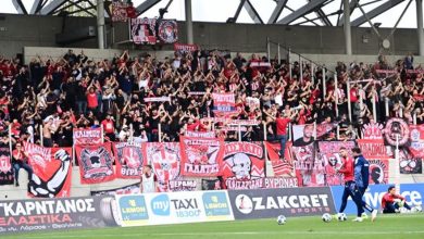 Εντυπωσιακή ατμόσφαιρα έχουν δημιουργήσει 1.000 οπαδοί του Ολυμπιακού στις εξέδρες του «AEL FC Arena«.