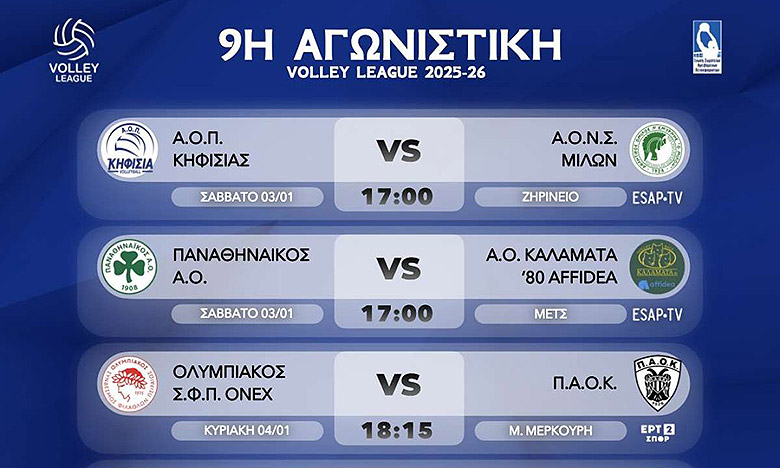 Volley League [Α]: Το πρόγραμμα της 9ης αγωνιστικής